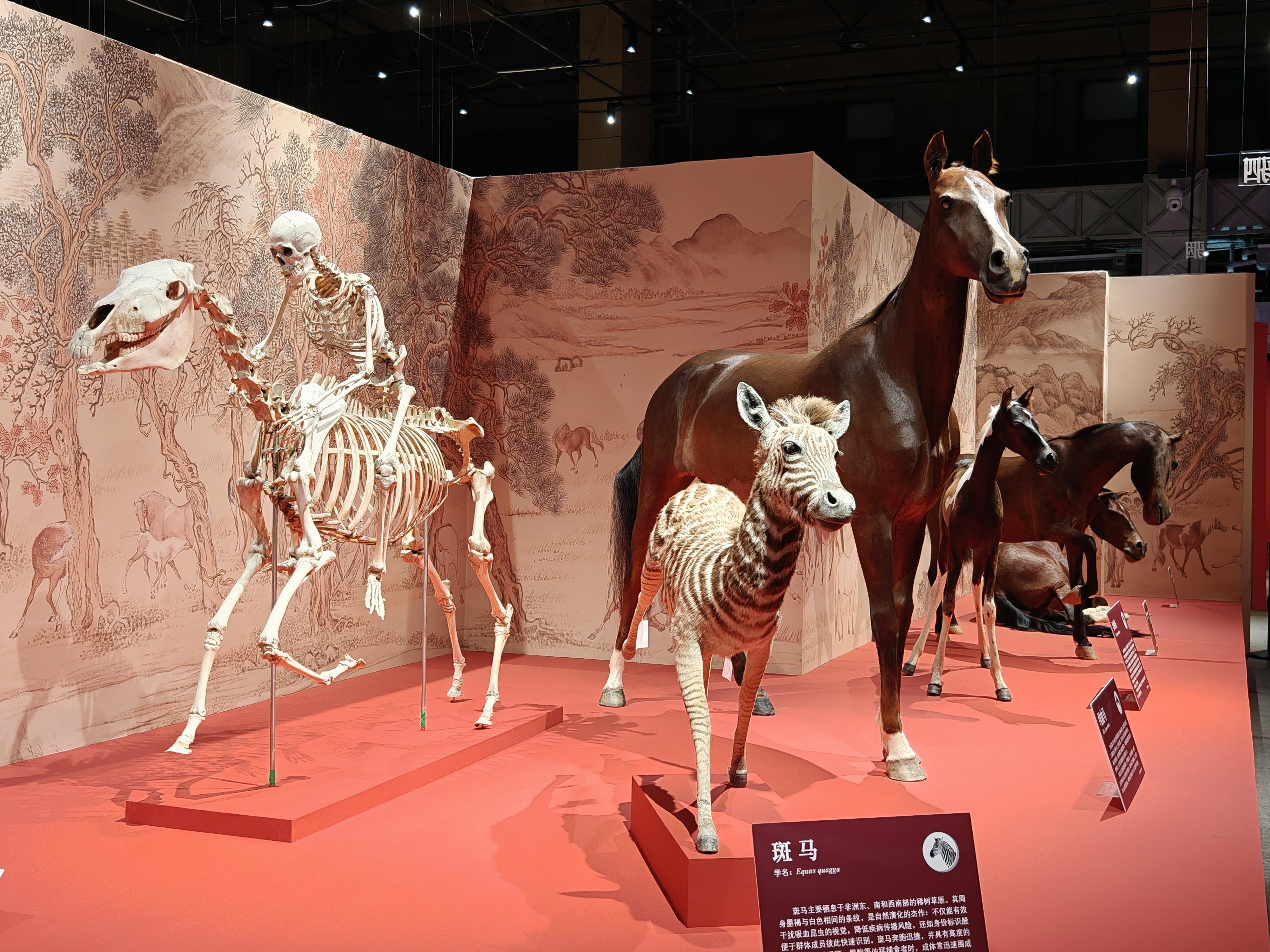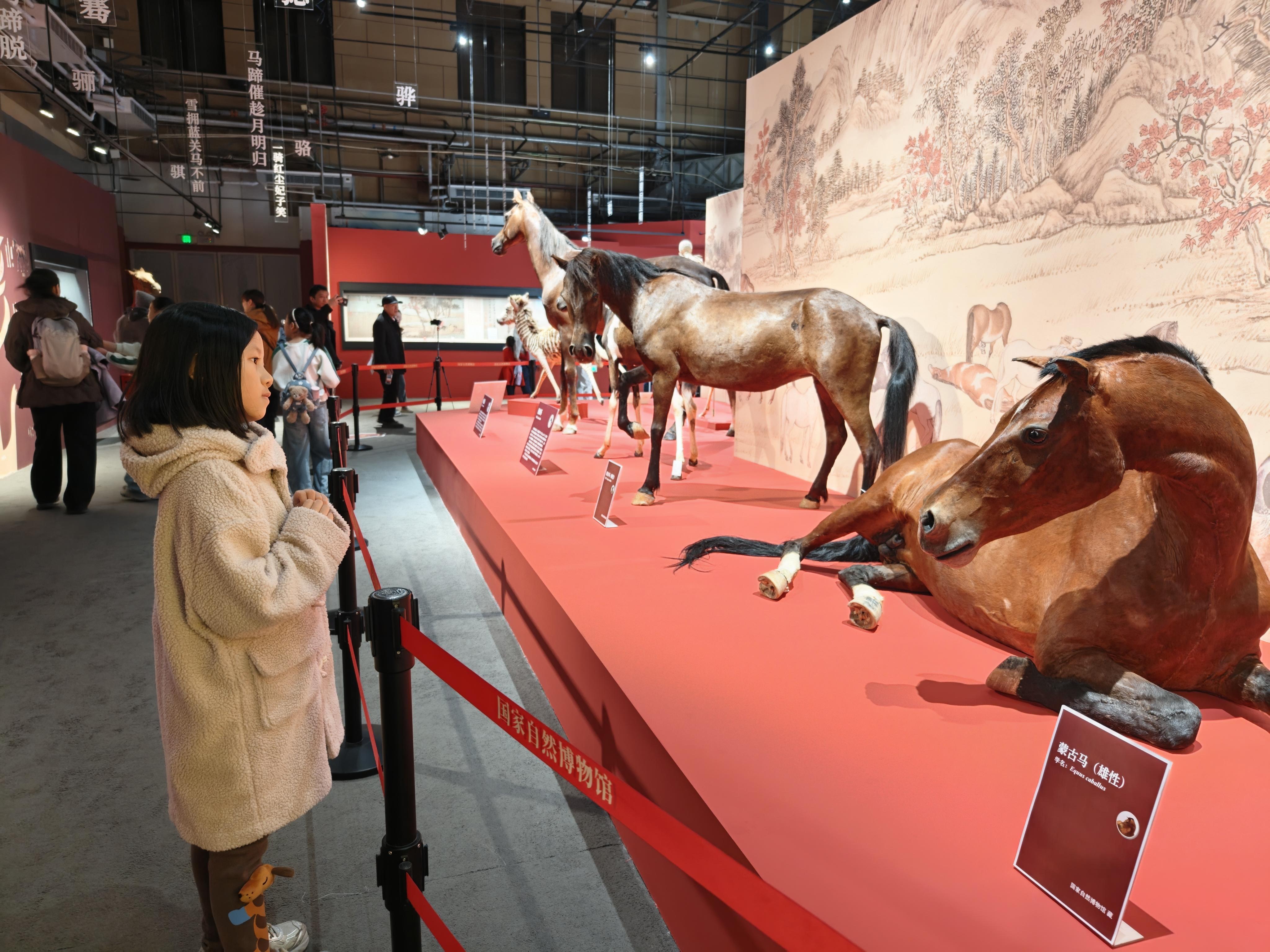 展览精心遴选了76件珍贵展品,内容涵盖自然科学与人文历史两大维度。观众可以通过详实的马种介绍、生动的化石标本,追溯马跨越5600万年的演化奇迹。从三趾马头骨化石,到蒙古马、汗血马等现代真马,再到被誉为“活化石”的国家一级保护动物普氏野马。这些珍贵标本,生动呈现了马科动物的多样性及其演化历程,让观众直观感受自然选择的神奇力量。展览还展出一系列承载厚重历史的文物珍品。琳琅满目的古代马鞍、马镫等马具,无声地述说着马在礼仪、军事、交通领域不可替代的核心地位。展览不仅体现了马作为“丝绸之路信使”“古代驿传高速”的历史角色,也生动展示了“马上封侯”的美好寓意以及历代书画中千姿百态的骏马形象,勾勒出一幅人马情深、意蕴绵长的文明画卷。