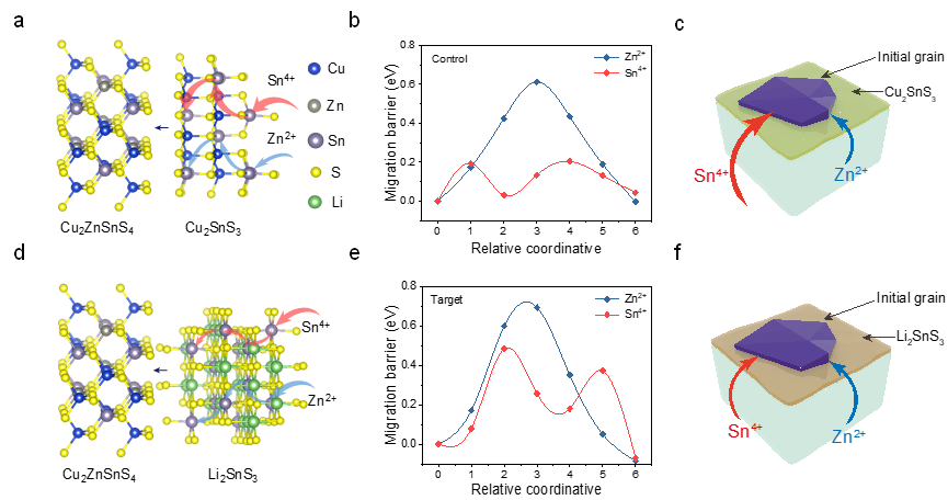 为此,青岛能源所研究团队提出一个巧妙的新思路:在铜锌锡硫硒材料内部引入一层“界面相”作为“交通指挥员”。这层名为Li₂SnS₃的特殊结构,可以在关键反应过程中引导金属离子按照正确路线移动,让晶体结构更加均匀、稳定。