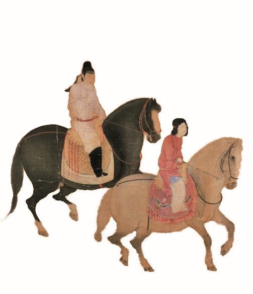 马鞍出现得较早,带鞍桥的马鞍出现于西汉末年。东晋时期开始出现专供达官贵人骑马用的更舒适的高桥鞍,北魏时期鞍桥的形制变化——前鞍桥高而直立,后鞍桥矮而向后倾斜。随着马鞍和马镫的普及,马也逐渐成为日常生活中广泛使用的交通工具,妇女也可以骑乘。唐代的《虢(ɡuó)国夫人游春图》就展示了一名矜贵的皇家妇人在随从的簇拥下,骑着配备了豪华服饰和鞍具的精良骏马悠然游春的景象。