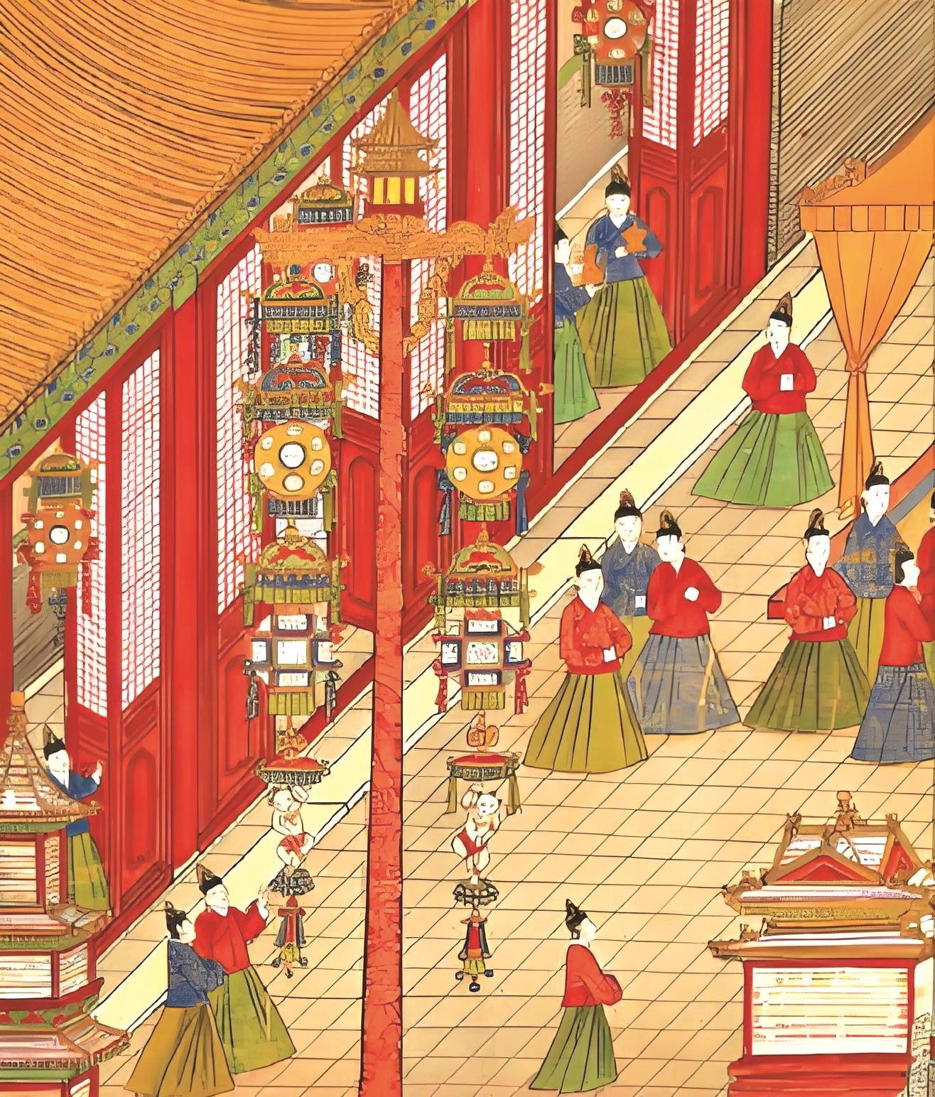 宫廷中过元宵节更热闹。明代《宪宗元宵行乐图》卷描绘的是明宪宗在皇宫庆祝元宵节的情景。只见皇宫内外张灯结彩,明宪宗身着盛装,欣赏各种精彩活动。连民间的街市都被搬进了皇宫,尽显烟火气:宫人、儿童手持鞭炮,炸开了满地碎红;货郎车上摆满各色玩具,引得人们竞相购买;杂耍艺人各显神通,钻圈、魔术、倒立……好不热闹。