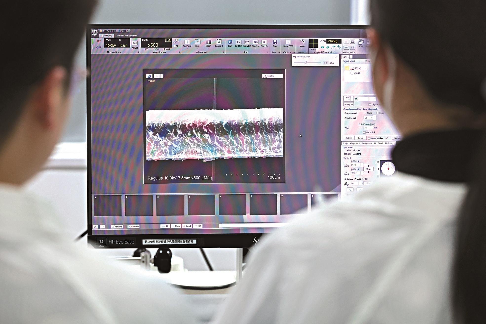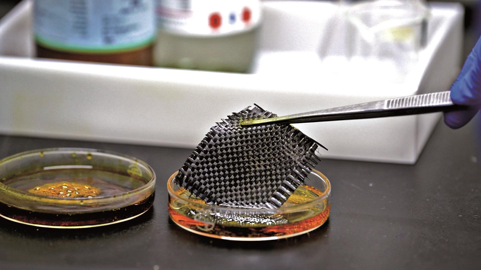 从实验室到规模化生产,这根细细的碳纤维是如何炼成的呢?原来,碳纤维的原料是一种叫丙烯腈(jīnɡ)的化学物质。技术人员先通过化学反应,把它做成黏稠的聚丙烯腈原液,再用特制的喷丝板像“挤面条”一样挤出来,经过“干喷湿纺”的工艺快速拉伸,再进入凝固液里定型。之后,这根细丝还要经过反复拉伸、清洗,越拉越细、越拉越密,里面的分子排列得整整齐齐,强度也跟着大幅提升。