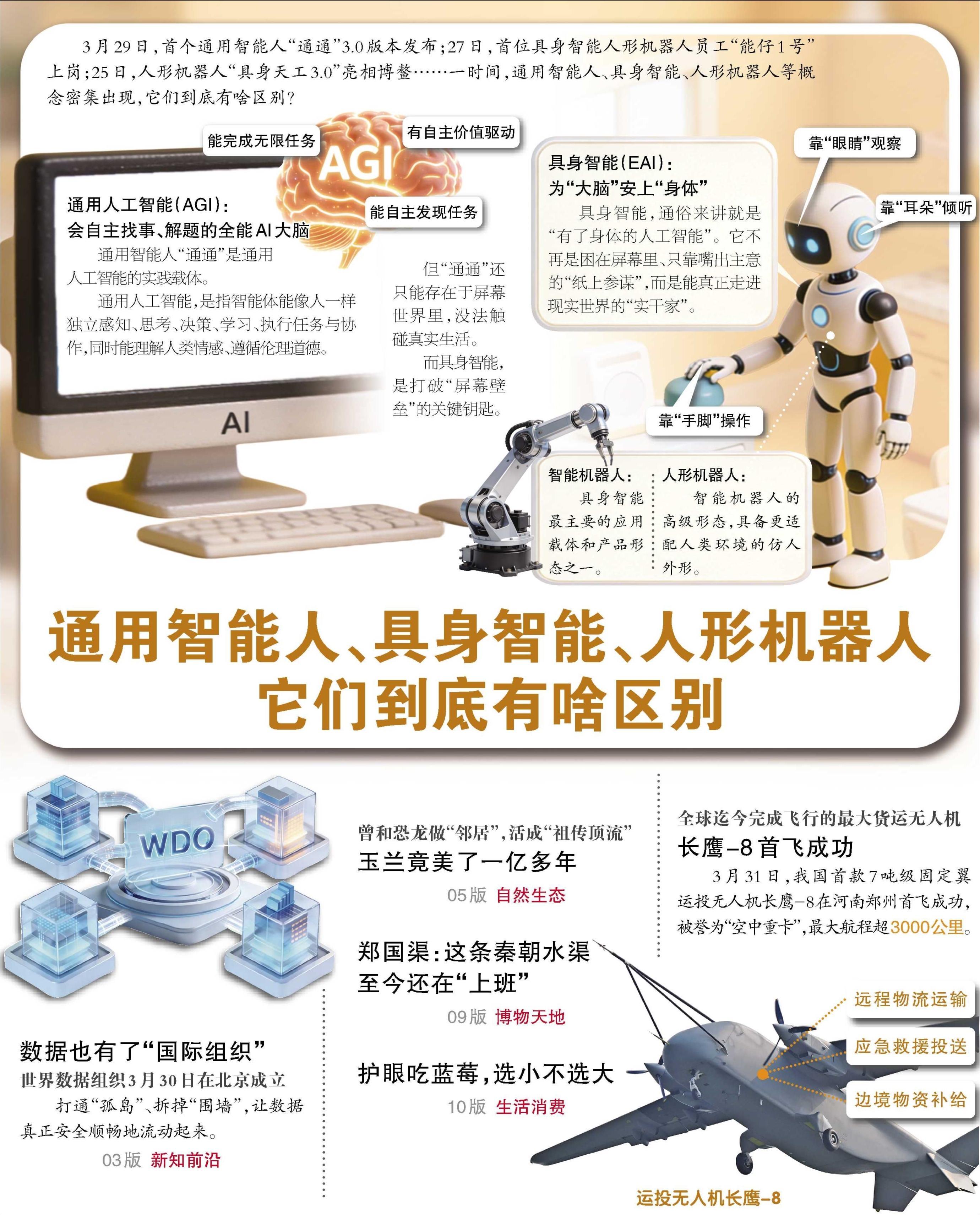 3月29日,首个通用智能人“通通”3.0版本发布;27日,首位具身智能人形机器人员工“能仔1号”上岗;25日,人形机器人“具身天工3.0”亮相博鳌……一时间,通用智能人、具身智能、人形机器人等概念密集出现,它们到底有啥区别?