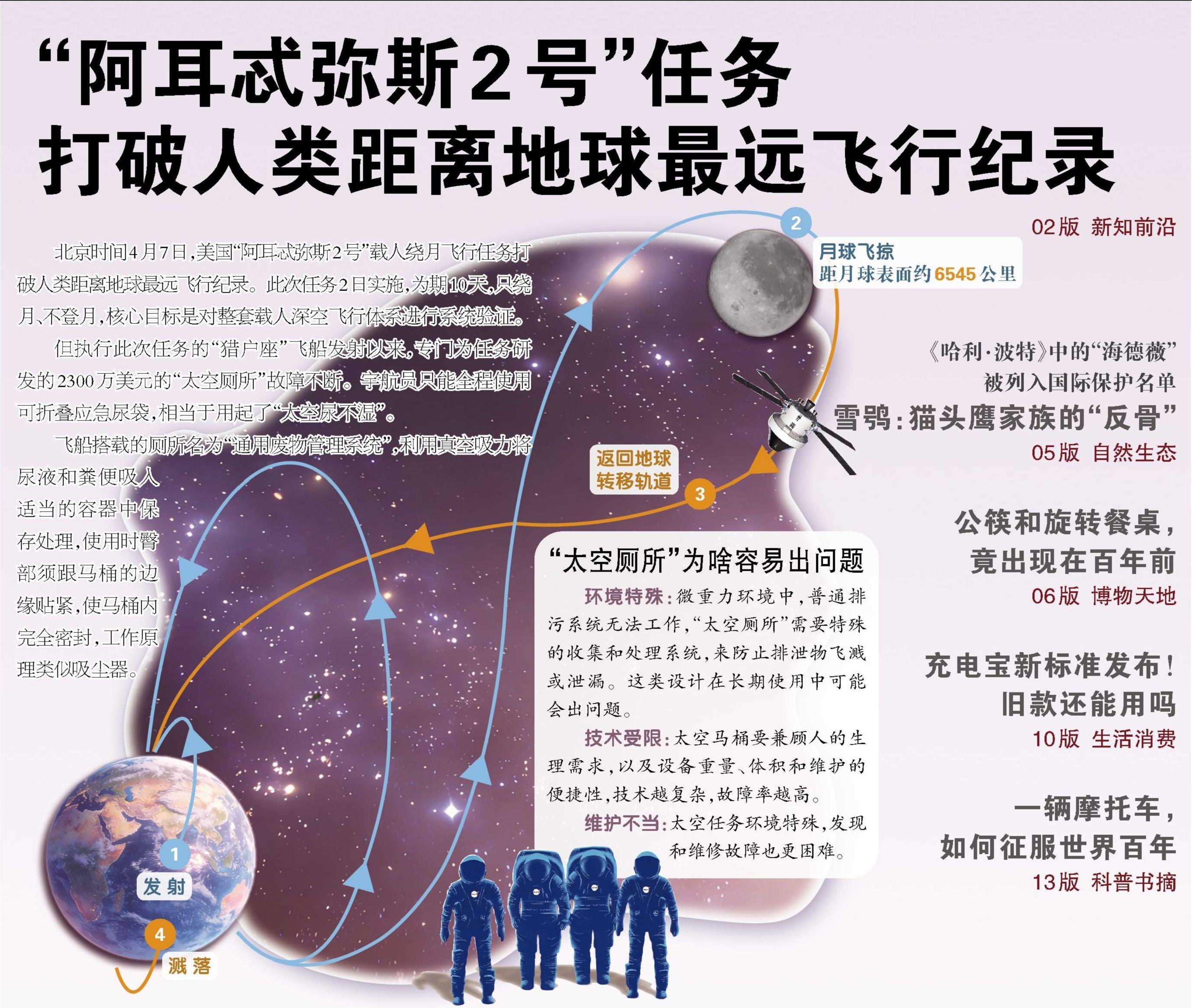 北京时间4月7日,美国“阿耳忒弥斯2号”载人绕月飞行任务打破人类距离地球最远飞行纪录。此次任务2日实施,为期10天,只绕月、不登月,核心目标是对整套载人深空飞行体系进行系统验证。