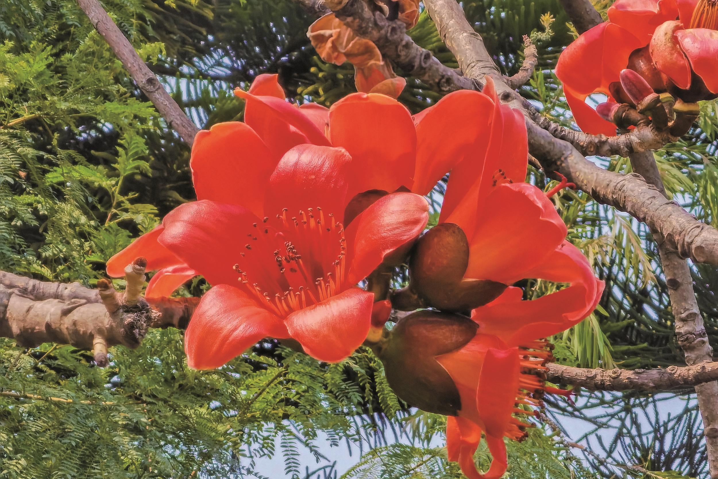 木棉自古被誉为“英雄花”。它树干高大挺拔,树皮布满粗硬瘤刺,宛若披甲而立的卫士,花开时满枝红焰,姿态昂然。清代屈大均形容它“排空攫挐(jué ná),势如龙奋”,尽显蓬勃生命力。近代诗人舒婷在《致橡树》中写道:“我有我红硕的花朵,像沉重的叹息,又像英勇的火炬”,让木棉超越草木本身,拥有独立、热烈、并肩而立的人格象征。