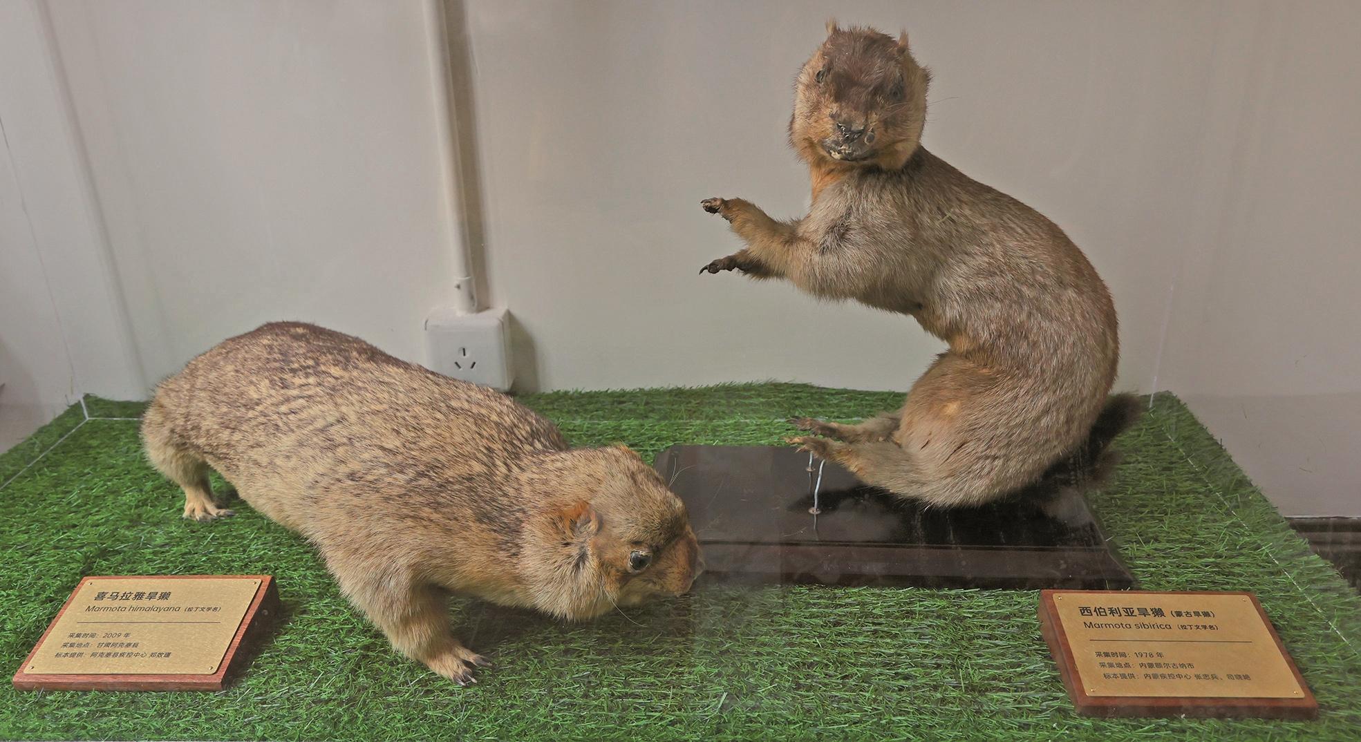 展柜中陈列着两只栩栩如生的旱獭(tǎ),看似呆萌,却是鼠疫的主要传染源之一。