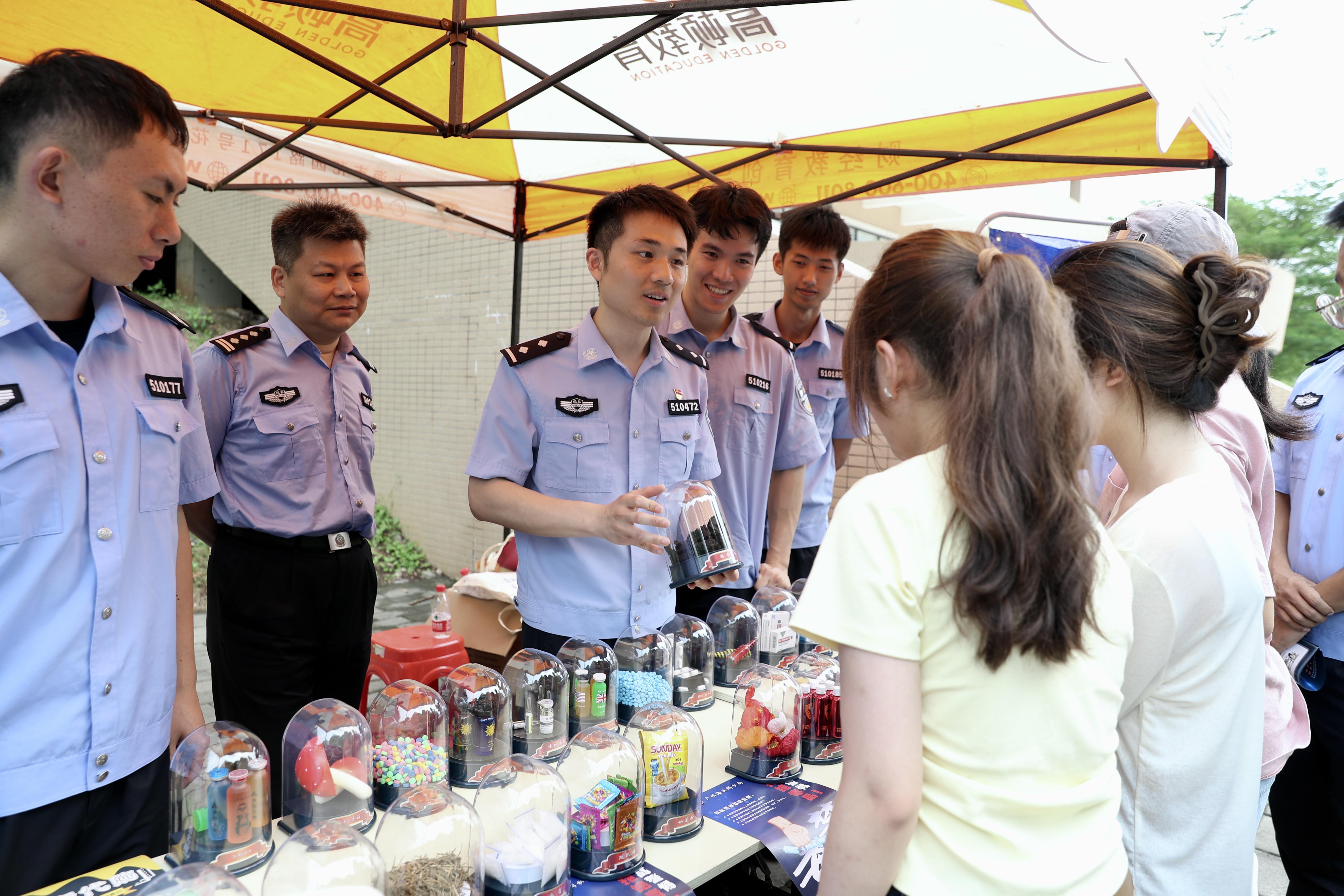 一旁的禁毒宣传区陈列着各类毒品仿真模型,除鸦片、冰毒等传统毒品仿真模型外,还有极具欺骗性的新型毒品模型,如印着卡通图案的“彩虹糖”颗粒、看似普通的“小树枝”、包装与市面产品无异的“奶茶粉”等。广州海关缉私局警员结合近年来查获的典型毒品走私案例,详细揭露毒品的伪装形态与巨大危害,传授识毒、防毒、拒毒的知识。