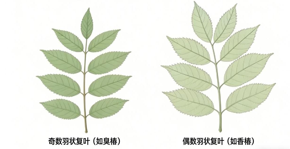 数叶片:奇偶羽状复叶一眼分清。臭椿为奇数羽状复叶,香椿则一般为偶数羽状复叶。复叶指多片小叶共同生长在一个叶柄上,羽状复叶则是小叶在叶轴两侧呈羽毛状排列。刺槐、紫云英等植物,除成对小叶外顶端还有一片,总数为奇数,属于奇数羽状复叶,臭椿便属此类;花生、皂荚等小叶成双、无顶生小叶,为偶数羽状复叶,香椿大多属于此类。只需简单数清叶片数量,就能快速区分二者。