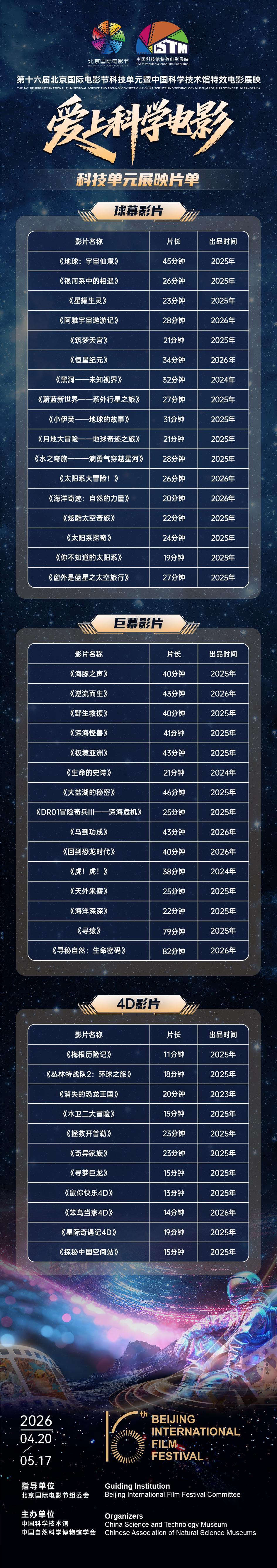 科普时报讯(记者王文洁)4月17日,记者从中国科学技术馆获悉,第十六届北京国际电影节科技单元暨中国科学技术馆特效电影展映活动,将于4月20日-5月17日在该馆举办,依托球幕、巨幕、4D三大沉浸式影院,集中展示来自13个国家的44部精品影片。活动期间,7部优秀国内外科学电影0元公益放映。