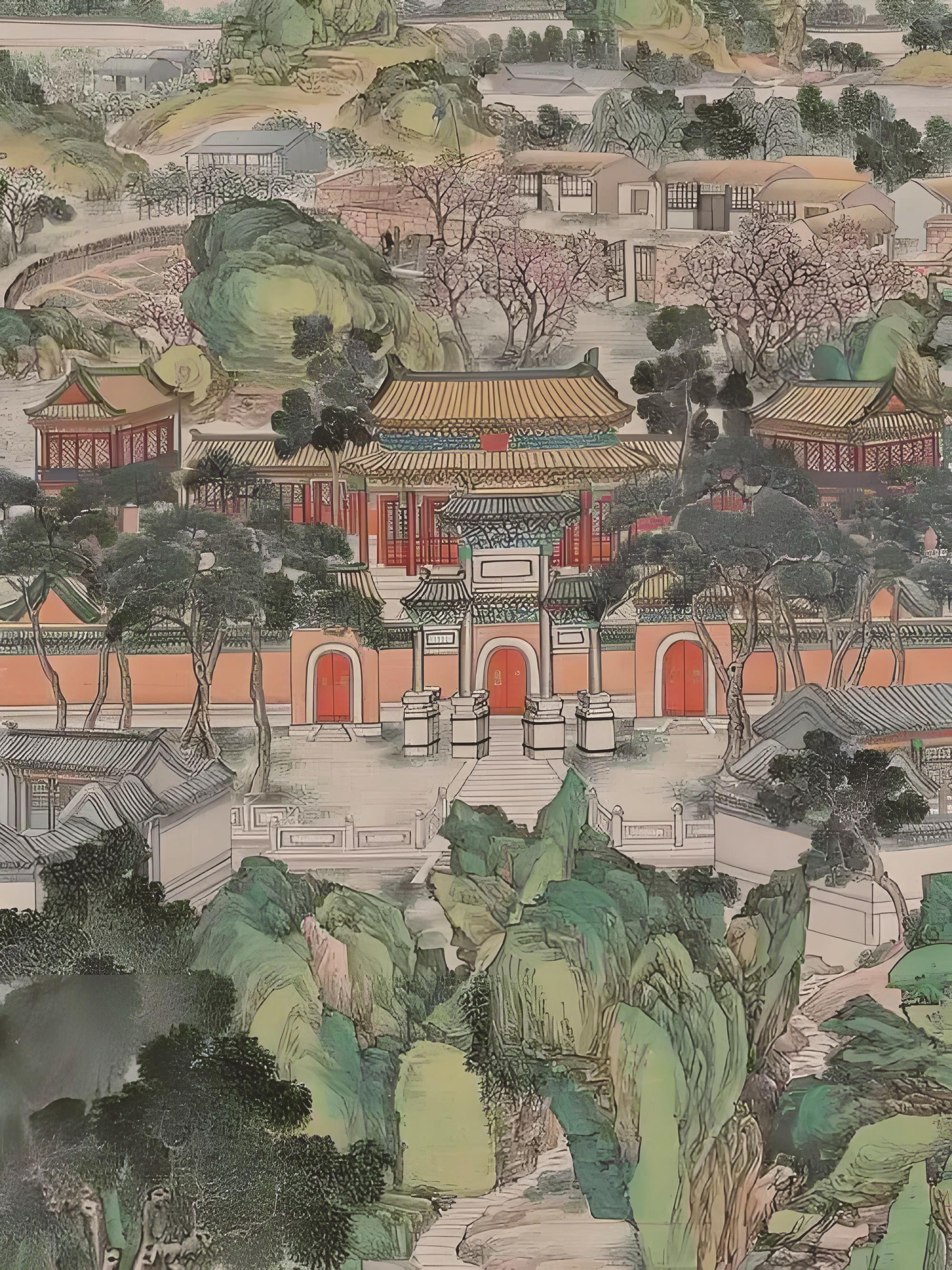 大观园“全景式呈现”描写,集中在“大观园试才题对额”中,以贾政携清客、宝玉巡园题额为线索,逐处拆解园林设计的匠心,堪称对大观园造园技艺与景致的“专业解读”。在大观园院门,“一带翠嶂挡在面前”,作品以贾政之口点出:“非此一山,一进来园中所有之景悉入目,则有何趣”,诠释了以假山障景造园的手法。