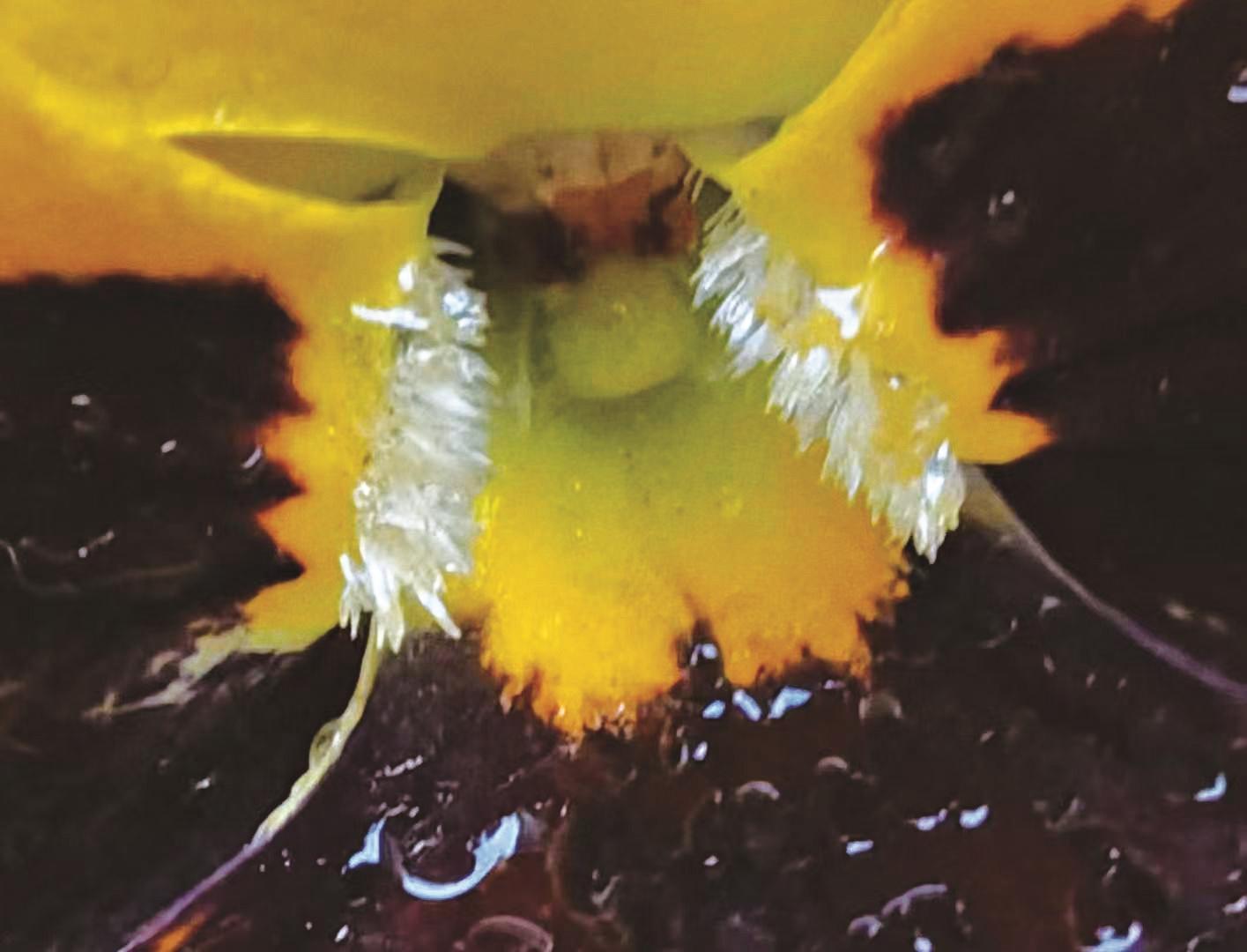 三色堇是堇菜科堇菜属二年或多年生草本植物。其生态策略独特,花朵结构也别具一格。4年前我在重庆拍下一朵带露珠的三色堇(图2),由花面中心可见八字形排列的两簇白毛(图3),此处正是蜜蜂采蜜的入口处。当蜜蜂把长喙插进去时,就会触及柱头上湿漉漉的唇瓣,喙上的花粉便被撸了下来。长喙继续深入,经过长有许多疣毛的区域,新的花粉又被粘上。