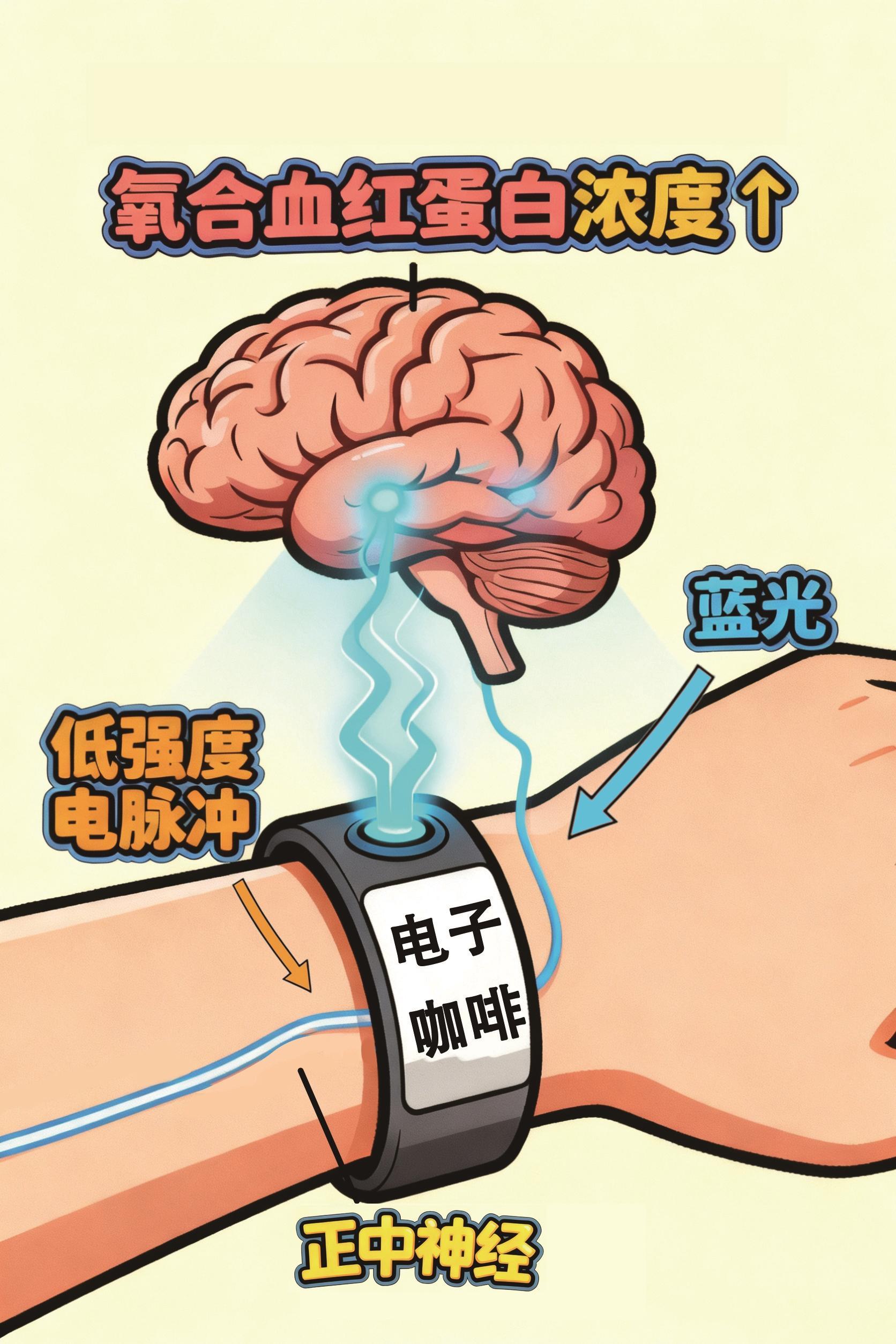解放军总医院第一医学中心神经内科副主任医师李懋解释,电子咖啡手环的提神原理与咖啡因不同,它是通过低强度电脉冲和蓝光等物理方式刺激手腕上的正中神经,从而对大脑功能产生影响。