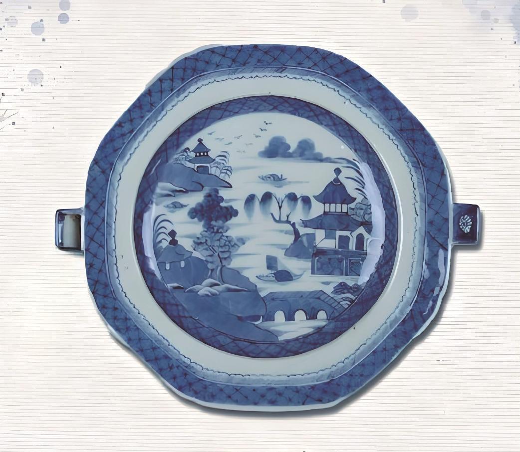 还有个特别之处,这只盘子纹饰和样式在国内都比较少见,它其实是清代的外销瓷,专为海外市场定制。这种饰有山水楼阁纹样的青花瓷器被称为“南京样式”,曾一度风靡18-19世纪的欧洲。