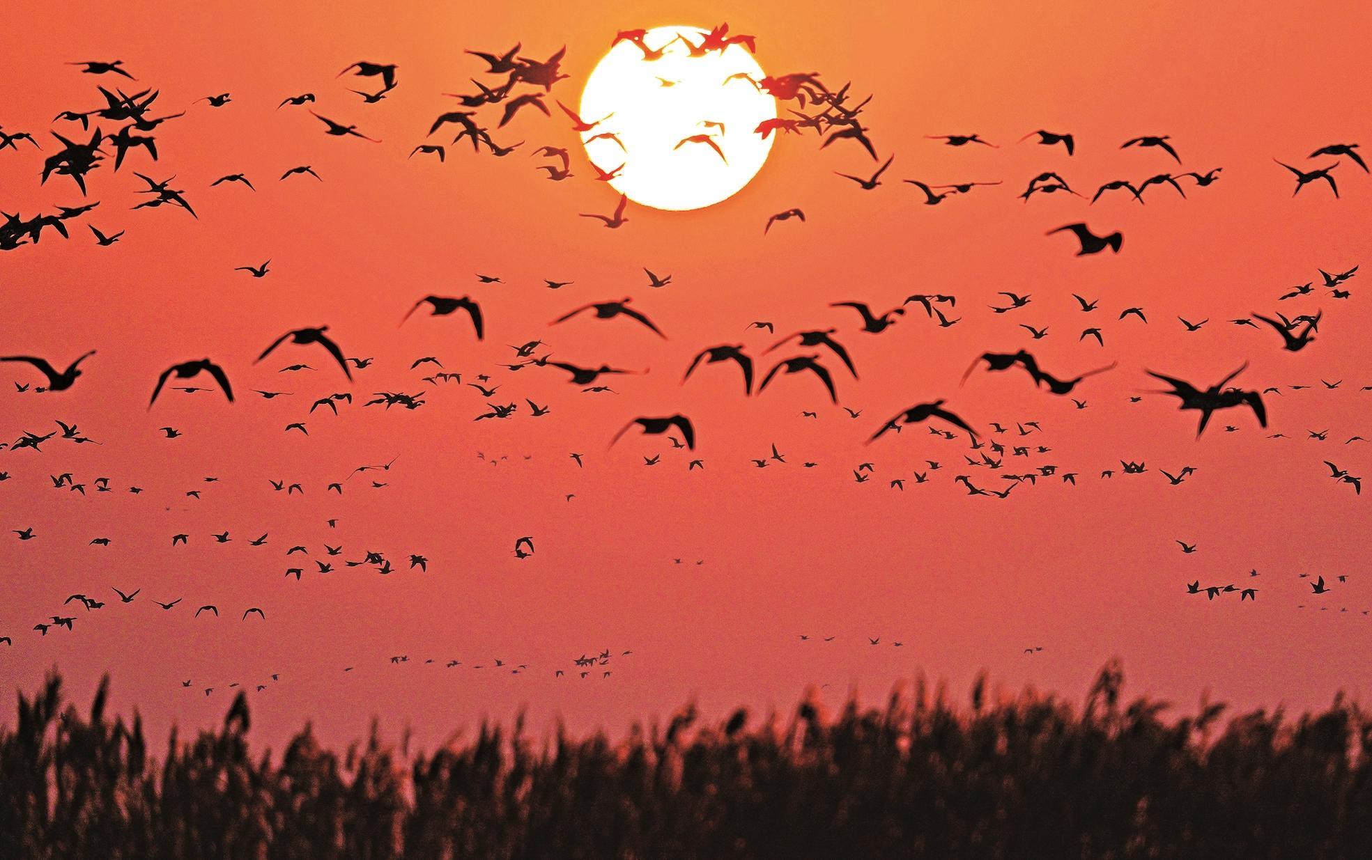 位于山东省东营市的黄河三角洲国家级自然保护区,今年再添2个新鸟种,鸟类总数从建区时的187种增加到了376种。这个以保护新生湿地生态系统和珍稀濒危鸟类为主的的湿地类型自然保护区,已经成为观鸟爱好者的“天堂”。图为12月17日,众多候鸟飞翔盘旋于保护区上空。视觉中国供图