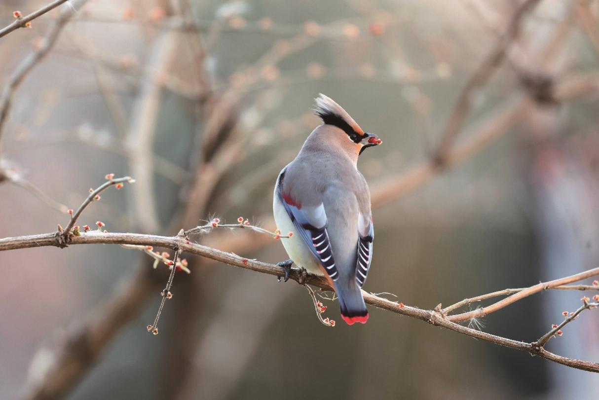 太平鸟常百十来只“组团”活动,专吃油松、蔷薇、忍冬、卫矛等植物的果实和嫩芽,体态优雅,叫声轻柔动听,是冬季园林里最吸睛的“小明星”。