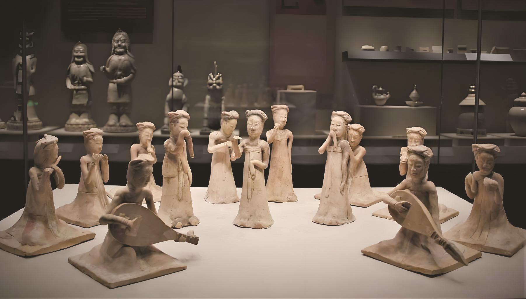 除了喜剧表演,还有乐队表演。这支由13人组成的乐队,包括8件乐俑和5件舞俑,她们一边奏乐、一边跳舞,还有个鼓掌拍手的“气氛组”。乐队队员统一穿窄袖襦衣、高腰束胸裙,配飘逸的锦带,统一佩戴梳子发饰。她们姿态各异、神情自然柔和,俨然一场精彩的乐队演出现场。