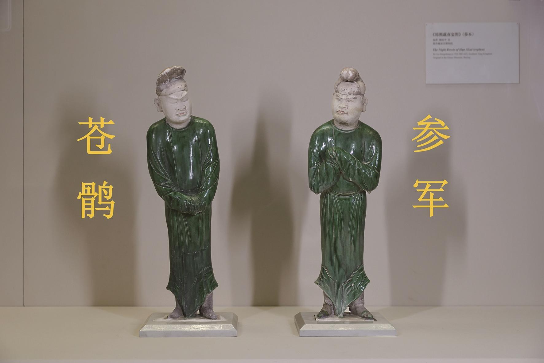 再看这两位穿绿色衣服的俳优俑,正在表演参军戏。左侧小哥是负责“怼”人的苍鹘(hú),右侧是被“怼”的是参军。参军通常表情夸张、动作滑稽,而苍鹘则负责引导戏剧情节,并引发观众的笑声。这种表演形式和今天相声里的逗哏、捧哏相似。他俩之所以穿绿衣服,跟表演的参军戏有关。参军是唐代的官职,官员官服以绿、青色为主。