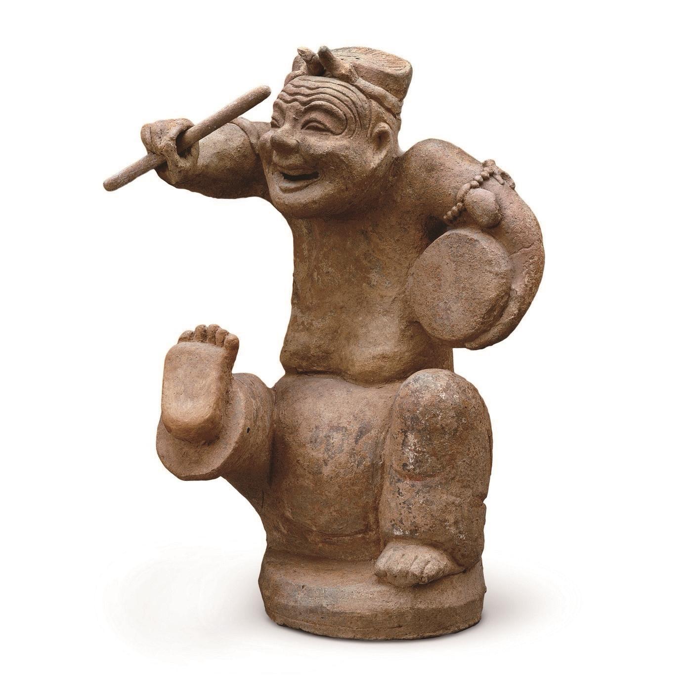 先来看一位汉代击鼓说唱老艺人的表演。他身材矮小,上身赤裸,袒襟鼓腹,额上系一花结帻(zé),臂膀戴着璎珞珠饰,赤足登台;左臂抱一面圆鼓,右臂高扬鼓槌,正要击鼓,却又悬而未落;凸出的大肚子下,左腿蜷坐圆榻上,伴着节奏奋力翘起右脚;配上夸张的笑容,将老艺人在宴会上的滑稽表演定格下来。