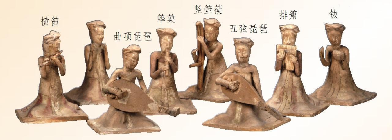 如果单独观察乐俑,可以清晰辨认出她们手中的乐器分别为:横笛、曲项琵琶、筚篥(bì lì)、竖箜篌(kōnɡ hóu)、五弦琵琶、排箫、钹(bó)。这一组合融合了吹奏、弹拨与打击三种演奏方式,展现了丰富而和谐的音乐形态。