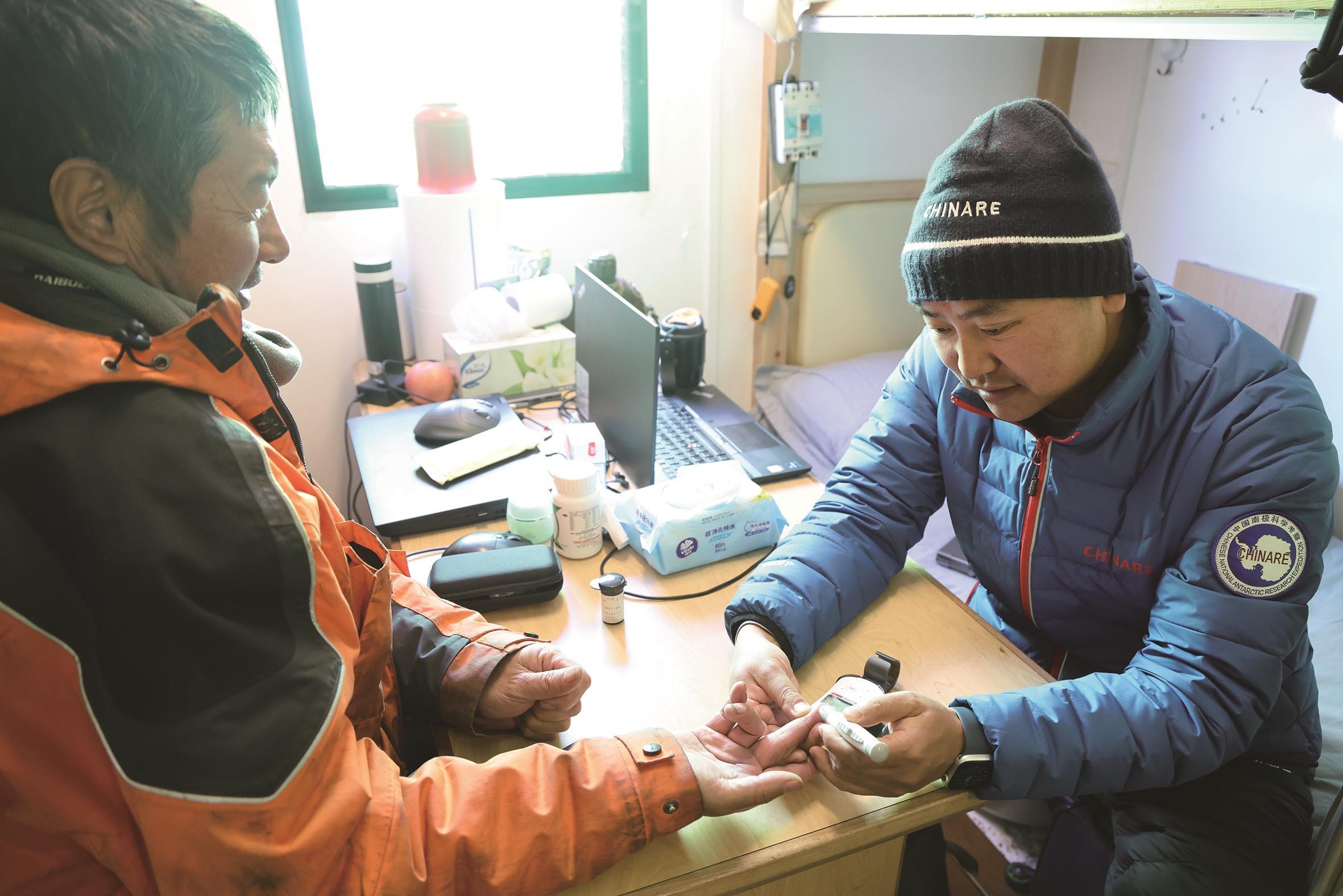 作为考察队的随队医生,保障大家的健康是我的核心职责。南极内陆海拔高、天气恶劣多变,给队员身体健康带来很大风险。我每天都会仔细检查医疗物资,确保外伤处理用品随时可用;还要时刻应对队友们考察过程中的外伤风险;同时也会定期巡查驻仓,密切关注队员们的身体指标,也留意着大家的心理健康状况。