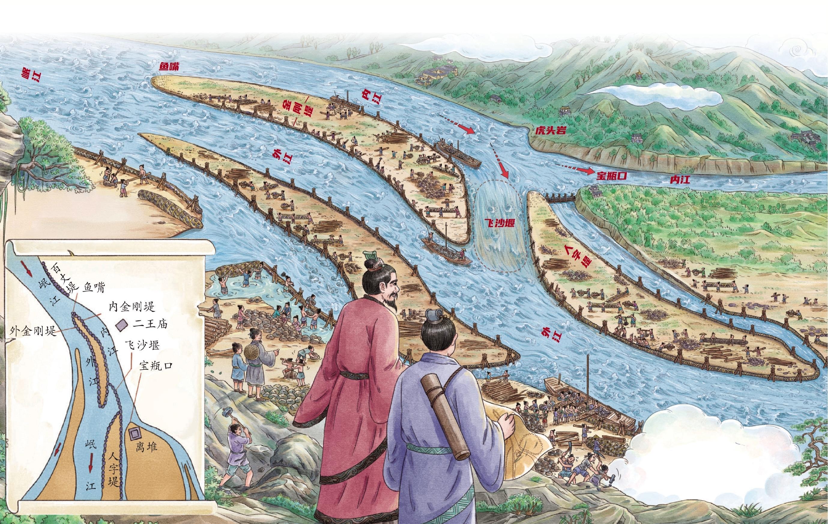 此外,“鱼嘴”既能缓冲水流冲击,又能透水滤沙,避免堤岸被洪水冲垮。
