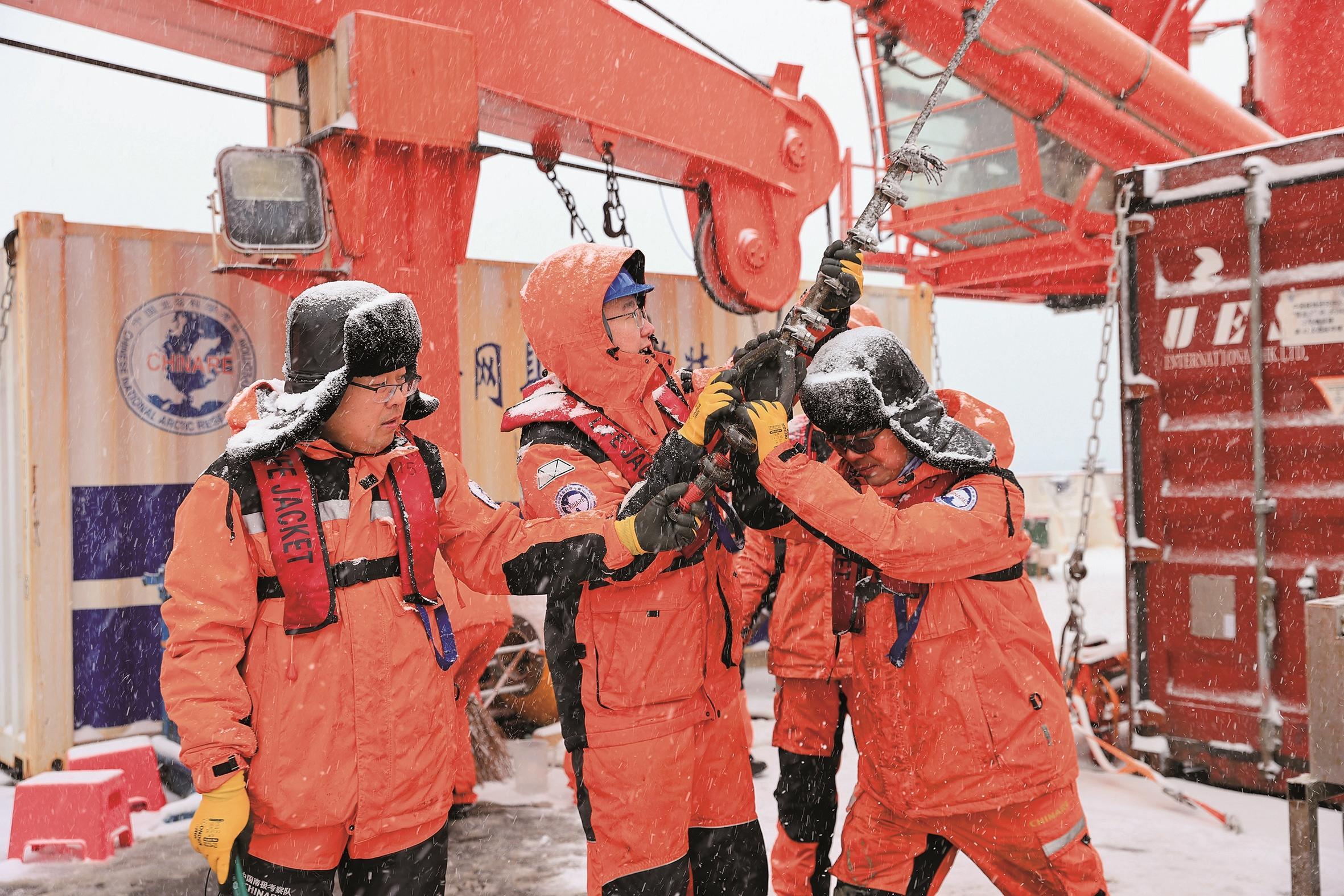 长城湾的天气变幻莫测。因此,长城站考察队员魏峥嵘、吕晓洋,时常要抓住时间窗口调试极地智能无人艇。他们主要承担长城站周边海域近岸海底地形测量作业任务,其成果将为南极考察与航行安全提供关键数据支撑。队员刘明亮正在重新铺设南极长城站压力式验潮系统电缆,保证验潮系统正常工作,为我国在南极开展前沿科学研究提供基础数据支持。