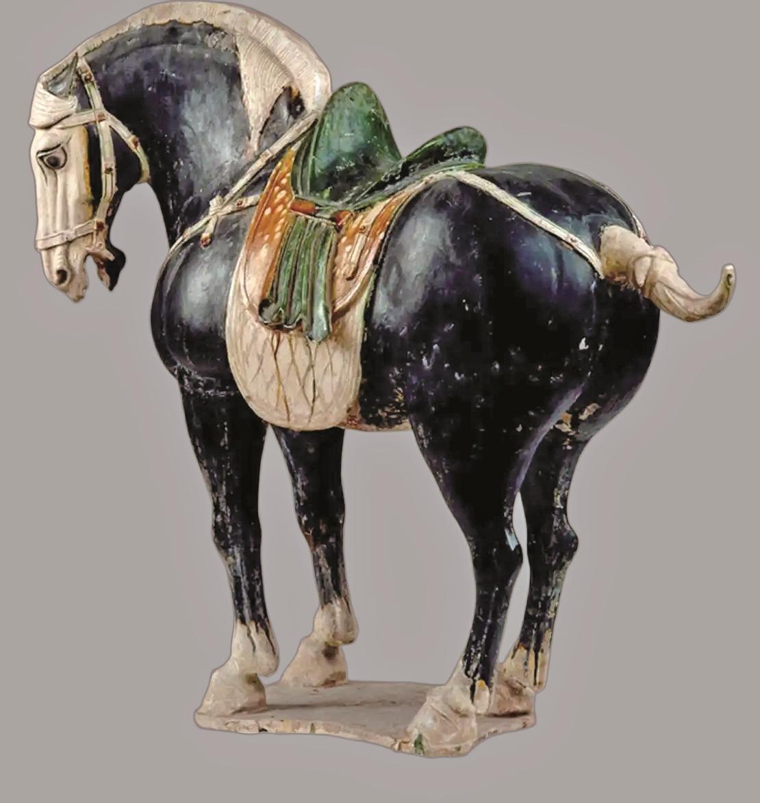另一件尤为珍贵的是三彩黑釉陶马。它通身披覆匀润的黑釉,仅面、鬃、尾、蹄施白,在绚丽的三彩中显得沉稳而独特,是难得的珍品。这匹“黑马”目前正在中国国家博物馆展出,其文创展品特别受欢迎。毕竟,大家都想成为一匹黑马。