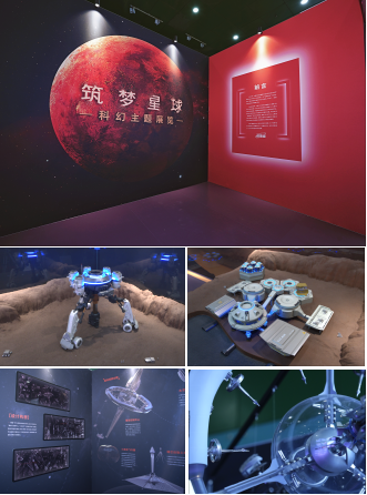 “筑梦星球”科幻主题展览展示面积约200平方米,设置了“荧惑探针——火星大气改造计划”“泰坦星燃料基地——星际远航的补给站”“蒲宫——星际探索的移动母舰”三大核心展区,聚焦于未来行星改造、能源利用与星际旅行等方向,通过浪漫恢宏的图文设计、立体美学的沙盘模型、引人入胜的互动装置和生动精致的衍生文创,带领观众逐步深入星际探索的科幻世界。