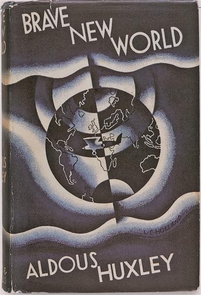 英国作家阿道斯·赫胥黎和他的《美丽新世界》首版封面。尹传红供图