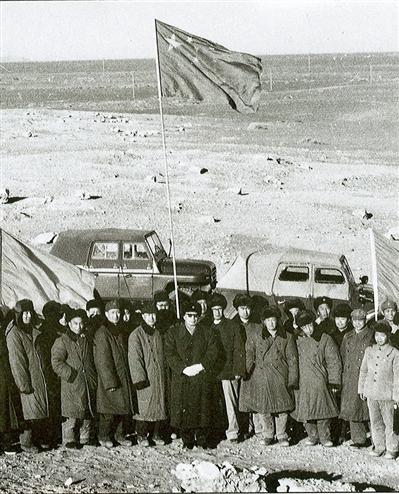 1966年10月27日,聂荣臻元帅(左五)在一望无际的茫茫戈壁上与参加导弹核武器试验的科技人员在一起。前排左四为钱学森,前排左二为梁思礼。