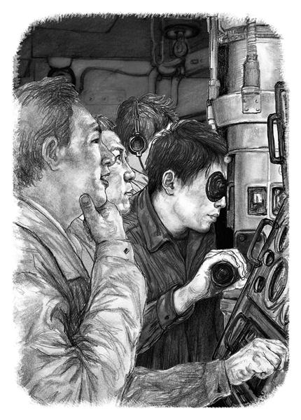 黄旭华(左一)随“长征四号”核潜艇潜至水下300米。