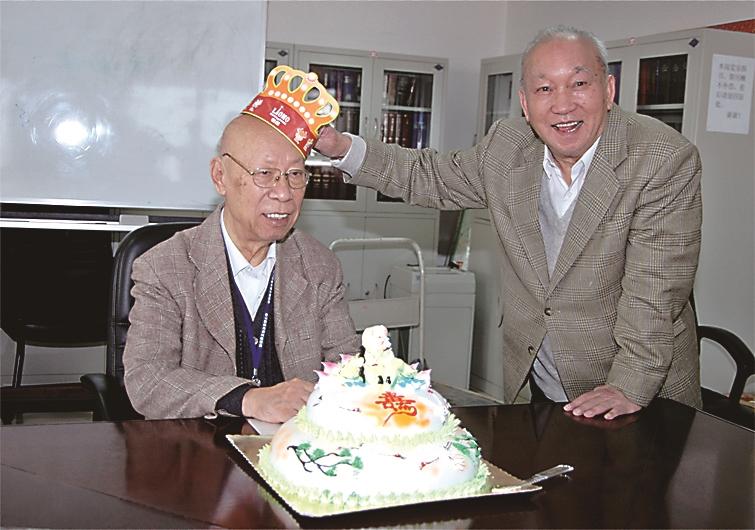 庄逢甘(左)与著名导弹和火箭控制系统专家梁思礼一起庆祝寿辰。