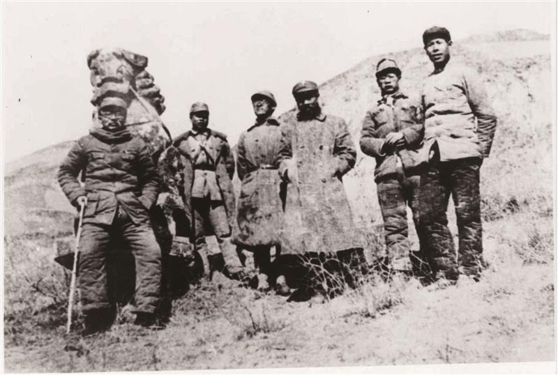 1940年初,陈康白(右三)与陕甘宁边区政府主席林伯渠(左一)等人在延安杜甫川考察自然科学院校址。