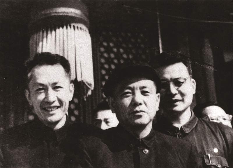 图①: 1966年国庆节,天安门城楼,左起朱光亚、彭桓武、邓稼先。张爱萍 摄
