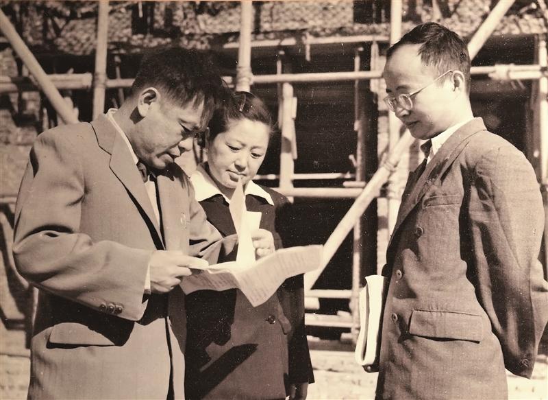 图②: 1959年,彭桓武(左)、何泽慧(中)、黄祖洽(右)在北京房山401所反应堆建设装置前。黄萌供图